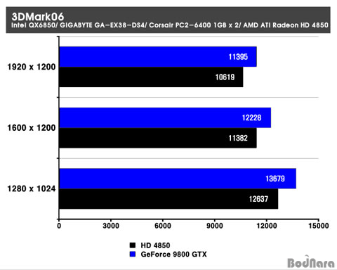 3DMark06 º¥Ä¡¸¶Å©´Â ±×·¡ÇÈ Ä«µåÀÇ ±âº» ¼º´ÉÀ» »ìÆìº¼ ¼ö ÀÖÀ¸¸ç, DirectX 9 ȯ°æÀÇ Shader Model 2.0°ú 3.0, ±×¸®°í HDRÀÇ Ã³¸® ¼º´ÉÀ» È®ÀÎÇÒ ¼ö ÀÖ´Ù. Å×½ºÆ®¸¦ ÁøÇàÇÑ ÇØ»óµµ ¸ðµÎ¿¡¼­ ¸ÕÀú µîÀåÇÑ GeFore 9800GTX°¡ »õ·Î µîÀåÇÑ HD 4850À» ¾Õ¼­°í ÀÖ´Ù. ÀÌ´Â µîÀåÇÑÁö ¾î´À Á¤µµ ½Ã°£ÀÌ Áö³ª µå¶óÀ̹öÀÇ ¾ÈÁ¤È­°¡ ÀÌ·ç¾îÁø °ÍÀ» ¹Ý¿µÇϸç, DirectX 9 Áö¿ø °ÔÀÓ¿¡¼­´Â GeFore 9800GTX°¡ À¯¸®ÇÏ´Ù´Â °ÍÀ» ¿¹»óÇØº¼ ¼ö ÀÖ´Ù.