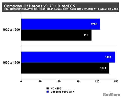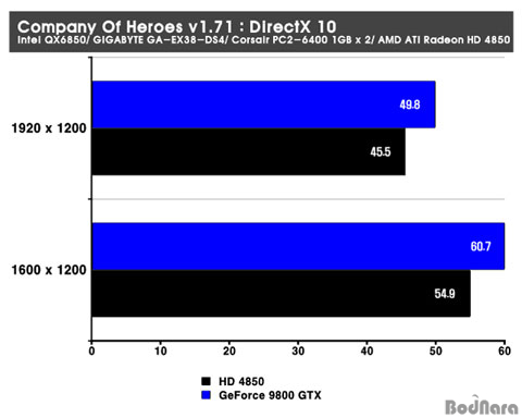 À̹ø¿¡´Â ½ÇÁ¦ °ÔÀÓÀÎ Company Of Heroes (COH)·Î v1.71 ÆÐÄ¡¸¦ Àû¿ëÇϸé DirectX 9¿Í 10 ȯ°æÀ» ¸ðµÎ »ìÆìº¼ ¼ö ÀÖ´Ù. Å×½ºÆ® °á°ú DirectX 9/ 10 ȯ°æ ¸ðµÎ¿¡¼­ ¾Õ¼­ »ìÆìº¸¾Ò´ø 3DMark06°ú °°ÀÌ Å×½ºÆ® ÇØ»óµµ ¸ðµÎ¿¡¼­ GeFore 9800GTX°¡ ¾Õ¼­°í ÀÖ´Ù. ÀÌ´Â ¾ÆÁ÷ ÃÖÀûÈ­°¡ ÀÌ·ç¾îÁöÁö ¾ÊÀº HD 4850À̹ǷΠµå¶óÀ̹ö ÃÖÀûÈ­¸¦ ÅëÇØ ¾î´À Á¤µµ Â÷À̸¦ ÁÙÀÏ ¼ö ÀÖÀ» °ÍÀ¸·Î ¿¹»óÇØº¼ ¼ö ÀÖÀ¸¸ç, ÀÌ °ÔÀÓÀÇ °æ¿ì Àü¹ÝÀûÀÎ ¼º´ÉÀÌ GeForce ½Ã¸®Áî°¡ ¾Õ¼­°í ÀÖ´Ù.