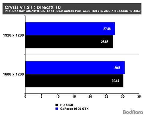 Crysis ¿ª½Ã NVIDIA¿¡ ÃÖÀûÈ­µÈ °ÔÀÓ Áß ÇϳªÀε¥ À̹ø Å×½ºÆ® °á°ú¿¡¼­µµ DirectX 10 ȯ°æÀÇ Å×½ºÆ®¸¦ ÁøÇàÇßÀ¸³ª ±Ù¼ÒÇÑ Â÷ÀÌ·Î GeFore 9800GTX°¡ ¾Õ¼­°í ÀÖ¾ú´Ù. ¾ÆÁ÷ HD 4850Àº µîÀå ÃʱâÀÓÀ» °¨¾ÈÇÏ¸é µå¶óÀ̹ö °³¼±À» ÅëÇÑ ¼º´É Çâ»óÀ» Á¶±Ý ´õ ±â´ëÇØº¼ ¼ö ÀÖ´Ù.