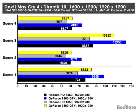 µ¥ºô ¸ÞÀÌ Å©¶óÀÌ4 µ¥¸ð º¥Ä¡¸¶Å© Å×½ºÆ®´Â Scene1/ 2/ 3/ 4 ¸ðµÎ¿¡¼­ GeForce ÃÖÀûÈ­ °ÔÀÓ´ä°Ô Àü¹ÝÀûÀÎ ¼º´ÉÀÌ GeForce 9800GTX°¡ À¯¸®ÇÑ °ÍÀ¸·Î ³ªÅ¸³µ´Ù. ƯÈ÷, HD 4850ÀÇ °æ¿ì AA/ AF¸¦ Àû¿ëÇÏÁö ¾Ê¾ÒÀ½¿¡µµ Á¦´ë·ÎµÈ ¼º´ÉÀ» ¹ßÈÖÇÏÁö ¸øÇÏ´Â ¹®Á¦¸¦ º¸¿© µå¶óÀ̹ö¿Í °ÔÀÓÀÇ È£È¯¼º°ú ÃÖÀûÈ­°¡ ÇÊ¿äÇØ º¸ÀδÙ.