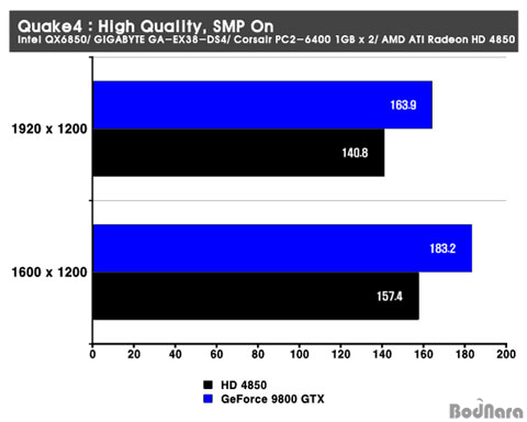 OpenGL °ÔÀÓÀº ´ëüÀûÀ¸·Î GeForce ½Ã¸®Áî°¡ ¿ì¼¼¸¦ º¸À̰í Àִµ¥ Quake4 Å×½ºÆ® ¿ª½Ã AA/ AF¸¦ Àû¿ëÇÏÁö ¾Ê¾ÒÀ» ¶§ÀÇ ¼º´É °á°ú´Â GeForce 9800GTX°¡ ¾Õ¼­°í ÀÖ´Ù.