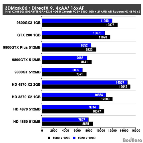 3DMark06Àº DirectX 9 ȯ°æÀÇ Å×½ºÆ®¸¦ ºñ±³ÇÒ ¼ö Àִµ¥ ¾Õ¼­ AA/ AF¸¦ Àû¿ëÇÏÁö ¾Ê¾ÒÀ» ¶§´Â ¼º´ÉÀÇ Â÷À̰¡ Å©°Ô ³ªÅ¸³ªÁö ¾Ê¾ÒÀ¸³ª AA/ AF¸¦ Àû¿ëÇÏÀÚ HD 4870 X2´Â ³»ºÎ ´ë¿ªÆø Áõ°¡¿Í GPUÀÇ ¼º´É Áõ°¡°¡ ÇÔ²² ÀÌ·ç¾îÁ® ó¸® È¿À²ÀÌ ³ô¾Æ °æÀï»çÀÇ µà¾ó GPU 9800 GX2¿Í GeForce GTX 280ÀÇ ¼º´ÉÀ» ÈξÀ ¶Ù¾î³Ñ´Â ³ôÀº ¼º´ÉÀ» º¸¿©ÁÖ°í ÀÖ´Ù.