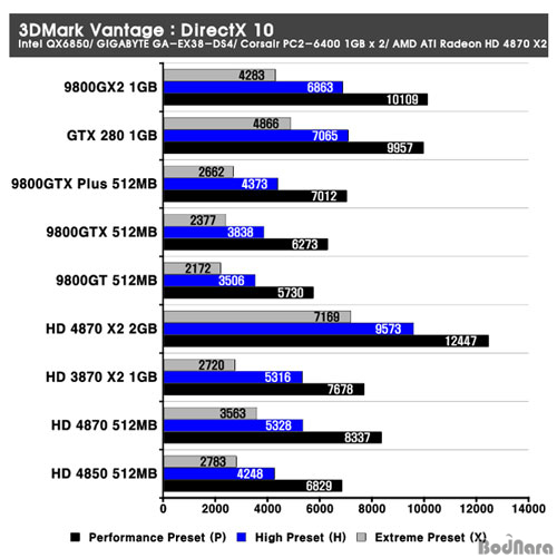 DirectX 10 ȯ°æÀ» Å×½ºÆ®ÇÏ´Â 3DMark Vantage Å×½ºÆ® ¿ª½Ã 3DMark06°ú ´Ù¸£Áö ¾Ê´Âµ¥ 1920 x 1080ÀÇ ÇØ»óµµ¿Í 4xAA/ 16xAF¸¦ Àû¿ëÇÑ Extreme Preset¿¡¼­µµ HD 4870 X2´Â HD 3870 X2ÀÇ µÎ ¹è¿¡ À̸£´Â ¼º´É Çâ»óÀÌ ÀÌ·ç¾îÁ³´Ù. °æÀï»çÀÇ Á¦Ç°µé°ú ºñ±³Çصµ Å©°Ô Çâ»óµÈ ¼º´ÉÀ» È®ÀÎÇÒ ¼ö ÀÖÀ¸¸ç, AA/ AF ó¸® ¼º´ÉÀÇ Çâ»óÀº 800°³·Î ´Ã¾î³­ ½¦ÀÌ´õ¿Í 16 ROPÀÇ Ã³¸® ¼º´É Çâ»ó µî¿¡ µû¸¥ HD 4800 ½Ã¸®ÁîÀÇ Æ¯Â¡À̱⵵ ÇÏ´Ù.