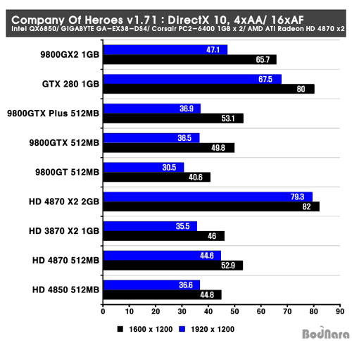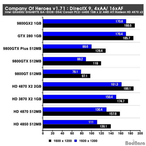 Company Of Heroes v1.71ÀÇ Å×½ºÆ®¿¡¼­ AA/ AF¸¦ Àû¿ëÇÑ DirectX 9 ȯ°æ¿¡¼­´Â Àü¹ÝÀûÀ¸·Î HD 4800 ½Ã¸®ÁîÀÇ ¼º´ÉÀÌ ¿ì¼öÇßÀ¸¸ç, HD 4870 X2 ¿ª½Ã AMD ATI Radeon ½Ã¸®Áî Áß¿¡¼­´Â °¡Àå ³ôÀº ¼º´ÉÀ» ³ªÅ¸³ÂÀ¸³ª °æÀï»çÀÇ µà¾ó GPU 9800 GX2³ª GeForce GTX 280µµ ¼±ÀüÇØÁÖ¾ú´Ù. DirectX 10 ȯ°æ¿¡¼­´Â HD 4870 X2°¡ 9800 GX2¿Í GeForce GTX 280¸¦ ¾ÕÁú·¶À¸¸ç, ƯÈ÷ °íÇØ»óµµÀÎ 1920 x 1200¿¡ 4xAA/ 16xAF¸¦ Àû¿ëÇÏ¿´À» ¶§ÀÇ ¼º´É ÀúÇϰ¡ Å©Áö ¾ÊÀº °ÍÀÌ Æ¯Â¡ÀÌ´Ù. ÀÌ´Â CrossFire ±¸¼º½Ã ³»ºÎ ´ë¿ªÆø Áõ°¡¿Í GPU °£ÀÇ ´ë¿©Æø Áõ°¡¿¡ µû¸¥ ¼º´É Çâ»óÀ¸·Î º¼ ¼ö ÀÖ´Ù.