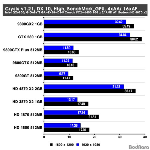 Crysis Å×½ºÆ® ¿ª½Ãµµ 4xAA/ 16xAF¸¦ Àû¿ëÇÏÀÚ AMD ATI Radeon Á¦Ç°±ºÀÇ ¼º´ÉÀÌ ¾Õ¼­°í ÀÖÀ¸¸ç, HD 3870 X2ÀÇ °æ¿ì ¼º´É ÀúÇϰ¡ Å©°Ô ³ªÅ¸³ª°í ÀÖ´ø ¹Ý¸é ¼º´ÉÀÌ Áõ°¡µÈ GPU 2°³¿Í ³»ºÎ ´ë¿ªÆø µîÀÌ Áõ°¡µÈ HD 4870 X2´Â °æÀï»çÀÇ µà¾ó GPUÀÎ 9800 GX2¿Í GeForce GTX 280¿¡ ±ÙÁ¢ÇÒ Á¤µµ·Î ¼±ÀüÇØÁÖ°í ÀÖ´Ù.