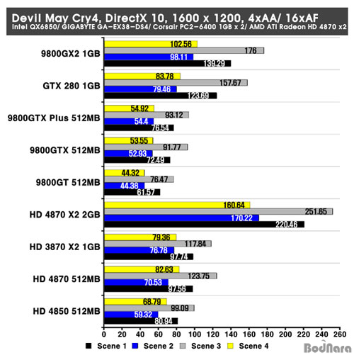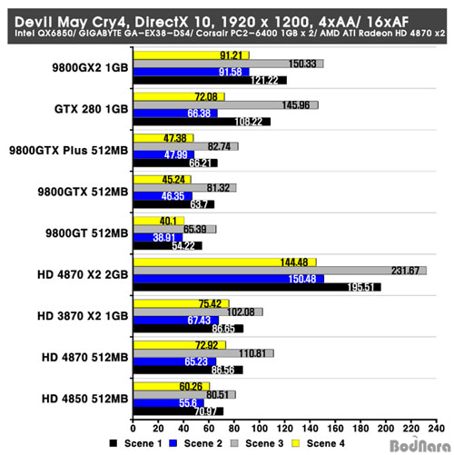 Devil May Cry4 Å×½ºÆ®´Â NVIDIA ±×·¡ÇÈ Ä«µåµéÀÌ HD 4800 ½Ã¸®Áîµé¿¡ 4xAA/ 16xAF¸¦ Àû¿ëÇÑ ÈÄ ¼º´ÉÀÌ ¶³¾îÁö´Âµ¥ HD 4870 X2´Â ´Ü¿¬ µ¸º¸ÀÏ Á¤µµ·Î ¶Ù¾î³­ ¼º´ÉÀ» ³ªÅ¸³»°í ÀÖ´Ù. AA/ AF¸¦ Àû¿ëÇÏÁö ¾Ê¾ÒÀ» ¶§ ¿ÀÈ÷·Á ¶³¾îÁö´Â ¼º´ÉÀ» ³ªÅ¸³»´Â °ÍÀº ±âÁ¸ HD 4870/ 4850°ú °°Àº ¸ð½ÀÀ» º¸¿©ÁÖ°í ÀÖ´Ù.
