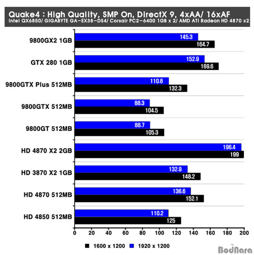 Quake4 Å×½ºÆ® ¿ª½Ã 4xAA/ 16xAF¸¦ Àû¿ëÇÏÀÚ HD 4800 ½Ã¸®ÁîµéÀÌ NVIDIA Á¦Ç°µéÀ» ¾Õ¼¹À¸¸ç, HD 4870 X2´Â °æÀï»çÀÇ µà¾ó GPUÀÎ 9800 GX2¿Í GeForce GTX 280À» ³Ñ¾î¼­´Â ³ôÀº ¼º´ÉÀ» º¸¿©ÁÖ°í ÀÖ´Ù.