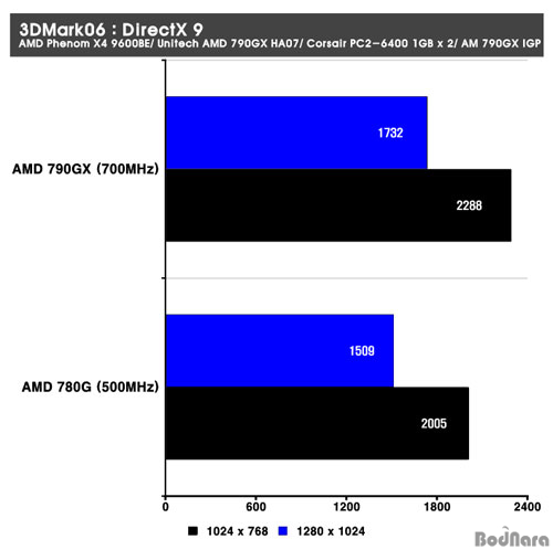 DirectX 9 ȯ°æ¿¡¼­ ±×·¡ÇÈ Ä«µåµéÀÇ ±âº» ¼º´ÉÀ» È®ÀÎÇØº¼ ¼ö ÀÖ´Â 3DMark06 Å×½ºÆ®¿¡¼­ AMD 790GX´Â AMD 780G¿Í ºñ±³ÇÏ¿© µ¿ÀÏ ½Ã½ºÅÛ ±¸¼º¿¡¼­ Çâ»óµÈ ¼º´ÉÀ» ³ªÅ¸³Â´Ù. AMD 790GX´Â 1024 x 768 ÇØ»óµµ¿¡¼­´Â ¾à 14%,  1280 x 1024 ÇØ»óµµ ¿ª½Ã ¾à 14.7%ÀÇ ¼º´É Çâ»óÀ» ³ªÅ¸³ÂÀ¸¸ç, ÀÌ´Â AMD 790GX´Â AMD 780GÀÇ ÄÚ¾î Ŭ·°ÀÎ 500MHzº¸´Ù ´õ ³ôÀº 700MHz°¡ Àû¿ëµÇ°í Àֱ⠶§¹®ÀÌ´Ù.
