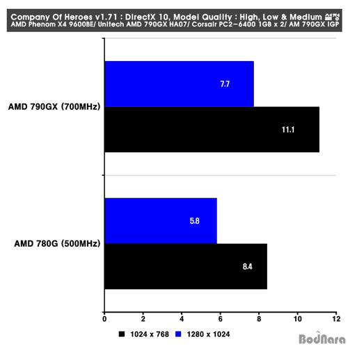 Company Of Heroes v1.71¿¡¼­´Â DirectX 9¿Í DirectX 10 ȯ°æÀ» ¸ðµÎ Å×½ºÆ®ÇÒ ¼ö ÀÖ°í ÀÌ¿¡ ¸ÂÃß¾î µÎ °¡Áö ȯ°æÀ» ¸ðµÎ Å×½ºÆ®Çß´Ù. DirectX 9¿Í DirectX 10 ȯ°æ ¸ðµÎ Model Quality¸¦ High·Î ³ª¸ÓÁö ¿É¼ÇµéÀº Low¿Í Medium, onÀ¸·Î ¼³Á¤Çß´Ù. AMD 790GX´Â ¾Õ¼­ÀÇ 3DMark06 Å×½ºÆ®¿¡¼­ ¾ð±ÞÇÏ¿´µíÀÌ ÄÚ¾î Ŭ·°ÀÌ AMD 780Gº¸´Ù 200MHz°¡ ³ôÀº 700MHz°¡ Àû¿ëµÇ°í ÀÖ¾î ÀÌ Å×½ºÆ®¿¡¼­ Ŭ·°¿¡ µû¸¥ ¼º´É Â÷À̸¦ ³ªÅ¸³Â´Ù.