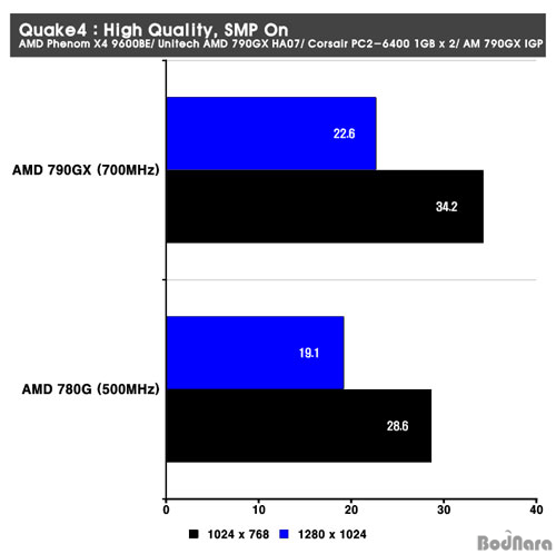 Quake4´Â ¸ÖƼ ÄÚ¾î¿Í OpenGLÀ» ±â¹ÝÀ¸·Î Çϰí ÀÖ´Â °ÔÀÓÀ¸·Î 1.4.2 ÆÐÄ¡¸¦ Àû¿ëÇÑ »óȲ¿¡¼­ÀÇ °á°úÀÌ´Ù. À̹ø Å×½ºÆ® ¿ª½Ã ¾Õ¼­ Å×½ºÆ®¸¦ ÁøÇàÇÑ 3DMark06°ú CoH °ÔÀÓ°ú °°ÀÌ Å¬·°ÀÌ ´õ ³ôÀº AMD 790GXÀÇ ¼º´ÉÀÌ ³ô¾Ò´Ù. 1024 x 768ÀÇ ÇØ»óµµ¿¡¼­´Â ¾à 19.6%, 1280 x 1024 ÇØ»óµµ¿¡¼­´Â ¾à 18.3%ÀÇ ¼º´É Çâ»óÀ» º¸¿´´Ù.