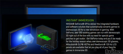 ¿©±â¿¡ ÃÖ±Ù¿¡´Â ºñÁÖ¾ó ÄÄÇ»ÆÃÀÌ ºÎ°¢µÊ¿¡ µû¶ó NVIDIA´Â 3D Àü¿ë ¾È°æÀ» ÅëÇØ °ÔÀÓ µî¿¡¼ ½ÇÁ¦ÀÇ Çö½ÇÀ» ¹Ý¿µÇÏ´Â µíÇÑ Âø°¢À» ºÒ·¯ÀÏÀ¸Å°´Â 3D Stereo µî°ú °°Àº ±â¼úµµ µµÀÔÇÏ¿© °ÔÀÓÀÇ Àç¹Ì¸¦ ³ô¿©ÁÖ°í ÀÖ´Ù.