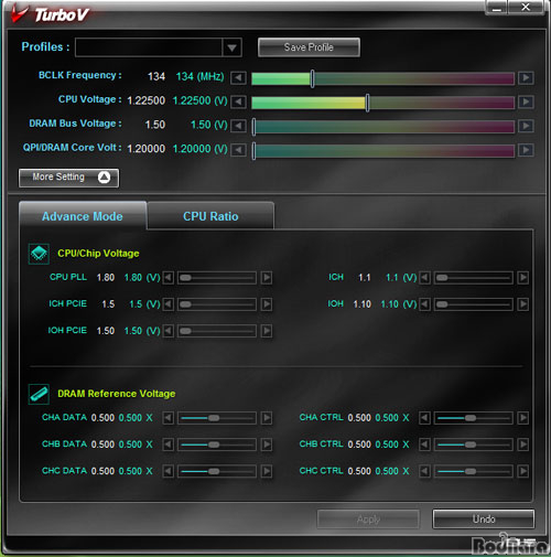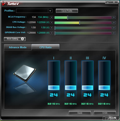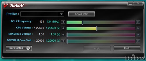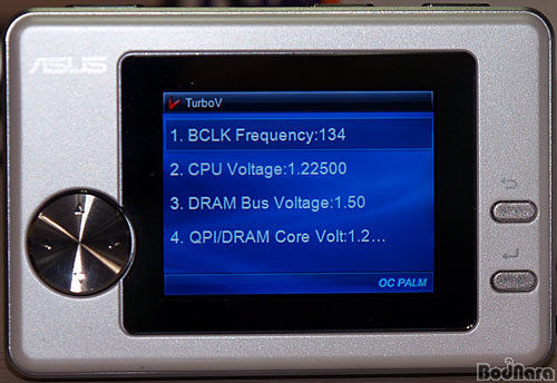 »ó´Ü ¿ìÃø 1¹ø°ú 2¹ø ¹öưÀ» ÀÌ¿ëÇÏ¿© TurboV À¯Æ¿¸®Æ¼¿Í ¿¬µ¿ÇÑ ¸ð½ÀÀ¸·Î CPU¿Í ¸Þ¸ð¸®, QPIÀÇ Àü¾Ð, ±×¸®°í Ŭ·°À» ½±°Ô Á¶ÀýÇÒ ¼ö ÀÖ´Ù.