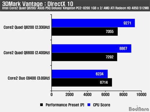 3DMark Vantage´Â DirectX 10 Áö¿ø Å×½ºÆ® ÇÁ·Î±×·¥À¸·Î ¸ÖƼ Äھ Áö¿øÇϴµ¥ ÀÌ¿¡ µû¶ó Äõµå ÄÚ¾î ÇÁ·Î¼¼¼­µéÀÇ ¼º´ÉÀÌ ³ô¾ÒÀ¸¸ç, Q8200Àº Q6600°ú ºñ±³ÇÏ¿© Àüü ½ºÄÚ¾î¿Í CPU ½ºÄÚ¾î ºÎºÐ¿¡¼­ ¾à°£ ´õ ³ôÀº ½ºÄھ ±â·ÏÇß´Ù. °íŬ·°ÀÇ µà¾ó ÄÚ¾î´Â Äõµå Äھ´Ù CPU¿Í Àüü ½ºÄÚ¾î ¸ðµÎ Äõµå Äھ´Ù ³·Àº ½ºÄھ ±â·ÏÇß´Ù.