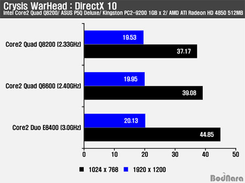 Crysis WarHead´Â DirectX 10À» Áö¿øÇÏ´Â °ÔÀÓÀ¸·Î °í¼º´ÉÀ» ¿ä±¸Çϴµ¥ 3DMark Vantage¿Í ´Þ¸® Q6600Àº CPU ¼º´ÉÀÇ ¿µÇâÀÌ Å« 1024 x 768ÀÇ ÀúÇØ»óµµ¿Í °íÇØ»óµµÀÎ 1920 x 1200 ¸ðµÎ¿¡¼­ ¾Õ¼¹Áö¸¸, ½ÇÁúÀûÀÎ Â÷ÀÌ´Â 2fps ³»¿ÜÀ̱⠶§¹®¿¡ ½ÇÁúÀûÀ¸·Î °ÔÀÓÀ» ÁøÇàÇÒ ¶§ ´À³¥ ¼ö Àִ ü°¨ ¼º´ÉÀ̳ª º¥Ä¡¸¶Å© °á°ú ¸ðµÎ Å« Â÷ÀÌ´Â ¾ø´Ù°íµµ º¼ ¼ö ÀÖ´Ù.