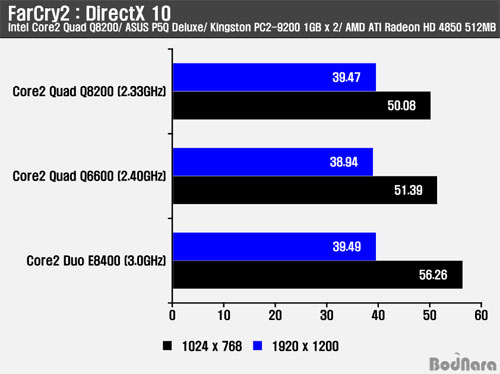 FarCry2µµ Crysis WarHead¿Í ¸¶Âù°¡Áö·Î DirectX 10À» Áö¿øÇÏ´Â °ÔÀÓÀ¸·Î À̹ø Å×½ºÆ® °á°úµµ CPUÀÇ ¿µÇâÀÌ Å« ÀúÇØ»óµµ´Â Q6600ÀÌ ±Ù¼ÒÇÏ°Ô ¾Õ¼¹À¸¸ç, GPUÀÇ ¿µÇâÀ» ¹Þ´Â °íÇØ»óµµ¿¡¼­´Â Q8200ÀÌ ±Ù¼ÒÇÏ°Ô ¾Õ¼­°í ÀÖ´Ù.