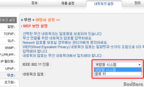 º¸¾È ¼³Á¤ ÆäÀÌÁö¿¡¼´Â IEEE 802.11 ÀÎÁõ ¼±Åðú ³×Æ®¿öÅ© ¾ÏÈ£ ÀÔ·ÂÀ» ÇØ¾ßÇϴµ¥ Ç¥±â°¡ À©µµ ±âÁذú ¾à°£ ´Ù¸£¹Ç·Î Âü°íÇÑ´Ù. ÀϹÝÀûÀ¸·Î ¸ðµç °øÀ¯±â´Â °³¹æÇü¸ðµå°¡ ±âº» ¿É¼ÇÀÌ´Ù. ÀÚ½ÅÀÌ »ç¿ëÇϰí ÀÖ´Â ¸ðµå¸¦ ¼±ÅÃÇÏ¿© ¼³Á¤ÇØ¾ß ÇÑ´Ù.