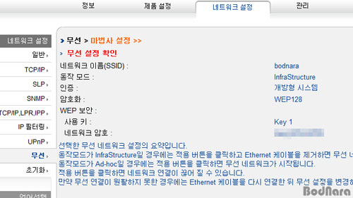¼³Á¤°ú ÇÔ²² WEP¾Ïȣȸ¦ »ç¿ëÇϰí ÀÖ´Ù¸é KEY°ªÀ» ÀÔ·ÂÇÏ¿© ÁØ´Ù. ¼³Á¤ÀÌ ³¡³ª¸é »ó´Ü ȸé°ú °°ÀÌ Á¤º¸°¡ Ç¥½ÃµÇ°í Àû¿ë¹öưÀ» ´©¸¥ µÚ À¯¼±³×Æ®¿öÅ©¸¦ Á¦°ÅÇϸé Àá½ÃµÚ¿¡ ¿¬°á Á¤º¸°¡ Ç¥½ÃµÊ°ú ÇÔ²² ¹«¼±À¸·Î Ãâ·ÂÀÌ °¡´ÉÇØÁø´Ù.