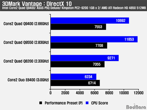3DMark Vantage´Â DirectX 10 Áö¿ø Å×½ºÆ® ÇÁ·Î±×·¥À¸·Î ¸ÖƼÄھ Áö¿øÇϴµ¥ Q9400Àº »óÀ§ Q9550º¸´Ù ³·Àº Ŭ·°°ú L2 ij½¬ Á¦°øÀ¸·Î ÀÌ¿¡ µû¸¥ ¼º´É Â÷À̰¡ ³ªÅ¸³µ°í Q8200°ú °íŬ·° E8400º¸´Ù ³ôÀº ó¸® ¼º´ÉÀ» º¸¿©ÁØ´Ù.