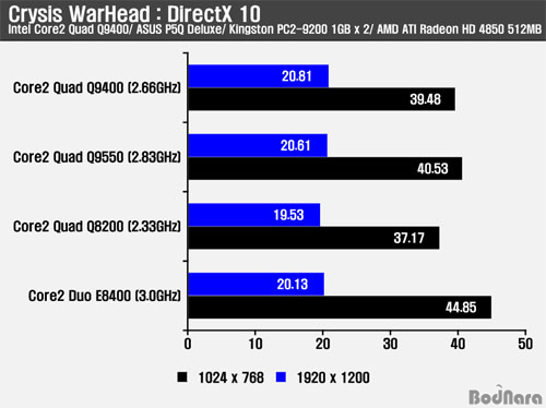 Crysis WarHead´Â DirectX 10À» Áö¿øÇÏ´Â °ÔÀÓÀ¸·Î °í¼º´ÉÀ» ¿ä±¸Çϴµ¥ 3DMark Vantage¿Í ´Þ¸® CPUÀÇ ¿µÇâÀ» ¹Þ´Â 1024 x 768ÀÌ ÀúÇØ»óµµ¿¡¼ Q9400Àº Q9550°ú Å« Â÷À̰¡ ¹ß»ýµÇÁö ¾Ê¾ÒÀ¸¸ç, À̹ø¿¡´Â ¿ÀÈ÷·Á °íŬ·° µà¾óÄÚ¾î CPUÀÎ E8400ÀÌ ÄõµåÄھ´Ù À¯¸®Çß´Ù. ÀÌ °ÔÀÓÀÇ °æ¿ì L2 ij½¬¿Í ÄÚ¾îÀÇ ¼öº¸´Ù °íŬ·°ÀÌ ´õ À¯¸®ÇÑ °ÍÀ¸·Î ³ªÅ¸³µ´Ù.