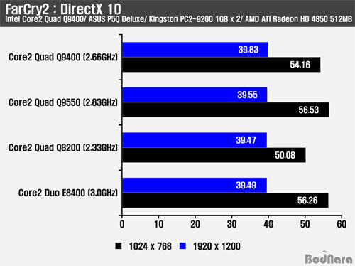 FarCry2 Å×½ºÆ® ¿ª½Ã DirectX 10 ȯ°æ¿¡¼ ÁøÇàÇßÀ¸¸ç, À̹ø Å×½ºÆ® °á°úµµ °íŬ·°ÀÌ À¯¸®ÇÏ°Ô ³ªÅ¸³ª °íŬ·° µà¾óÄھ CPUÀÇ ¿µÇâÀÌ Å« ÀúÇØ»óµµ¿¡¼ Q9550¿¡ ±ÙÁ¢ÇÏ´Â ¼º´ÉÀ» º¸¿©ÁØ´Ù. Q9400Àº Ŭ·°°ú L2 ij½¬ Â÷ÀÌ·Î ÀÎÇØ Q9550¿¡´Â ¹ÌÄ¡Áö ¸øÇßÁö¸¸, Q8200À» ¾Õ¼± ¼º´ÉÀ» º¸¿©ÁØ´Ù.