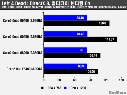 Left 4 Dead´Â DirectX 9 ȯ°æ¿¡¼ Å×½ºÆ®°¡ ÁøÇàµÇ¾úÀ¸¸ç, ÇÏÇÁ¶óÀÌÇÁ ¼Ò½º¿£Áø ±â¹ÝÀ¸·Î ¸¸µé¾îÁ³°í ¸ÖƼÄÚ¾î ·»´õ¸µÀ» Áö¿øÇÏ¿© ÄõµåÄÚ¾î CPUµéÀÌ À¯¸®ÇÏ´Ù. À̹ø Å×½ºÆ® °á°ú´Â °íŬ·° µà¾óÄھ´Ù °íŬ·° ÄõµåÄÚ¾îµéÀÌ À¯¸®ÇÏ°Ô ³ªÅ¸³µ´Ù. ƯÈ÷, Q9550Àº Q9400´ëºñ ³ô¾ÆÁø Ŭ·°°ú 2¹è ¸¹Àº 12MB L2 ij½¬·Î CPUÀÇ ¿µÇâÀÌ Å« 1024 x 768 ÇØ»óµµ¿¡¼ ²Ï ¸¹Àº ÇÁ·¹ÀÓ Â÷À̸¦ ³ªÅ¸³Â´Ù.