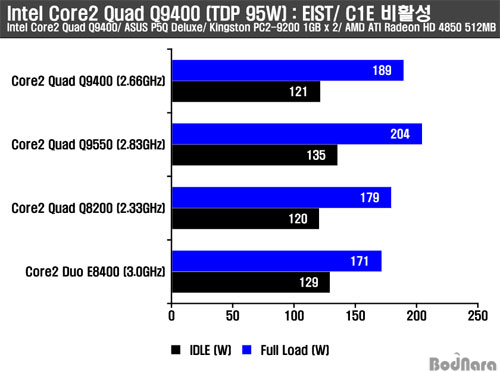 Å×½ºÆ®¿¡ »ç¿ëµÈ 4Á¾Àº ¸ðµÎ 45nm °øÁ¤ÀÌ Àû¿ëµÇÁö¸¸, °íŬ·° µà¾óÄÚ¾îÀÎ E8400Àº ÄõµåÄÚ¾îµéº¸´Ù 2°³ ÀûÀº ÄÚ¾î¿Í 65W TDPÀÇ ½ºÆåÀ» °¡Áö´Â ¸¸Å ÄõµåÄÚ¾î´ëºñ ³·Àº ¼ÒºñÀü·ÂÀ» º¸¿©ÁÖ°í ÀÖÀ¸³ª ¸ÞÀνºÆ®¸² ÄõµåÄÚ¾î Q8200º¸´Ù ³ôÀº Ŭ·°ÀÇ ¿µÇâÀ¸·Î ÀúŬ·° ÄõµåÄÚ¾î¿Í ±ÙÁ¢ÇÑ ¼ÒºñÀü·ÂÀ» º¸¿©ÁØ´Ù. Q9400Àº Q9550º¸´Ù ³·Àº Ŭ·°°ú L2 ij½¬ (6MB) Á¦°øÀ¸·Î Q9550º¸´Ù ¾ÆÀ̵鿡¼ 14W, Ç®·Îµå¿¡¼ 15WÀÇ Â÷À̸¦ º¸¿©ÁØ´Ù.