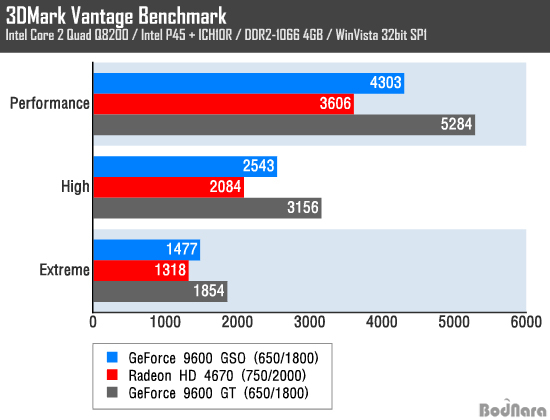 3DMark Vantage º¥Ä¡¸¶Å© Å×½ºÆ® °á°ú ÁöÆ÷½º 9600 GSO 512´Â ½ºÆ®¸² ÇÁ·Î¼¼¼ ¼ýÀÚ°¡ Â÷À̳ª´Â ÁöÆ÷½º 9600 GTº¸´Ù´Â ¶³¾îÁöÁö¸¸ °æÀï ¸ðµ¨ ¶óµ¥¿Â HD 4670º¸´Ù ³ôÀº Á¡¼ö¸¦ ±â·ÏÇß´Ù. Å×½ºÆ® ¿É¼ÇÀÌ ¿Ã¶ó°¥¼ö·Ï ±× Â÷À̰¡ ÁÙ¾îµé±â´Â ÇÏÁö¸¸ ÃÖ°í·Î ³ôÀº ÀͽºÆ®¸²(Extreme) ¸ðµå¿¡¼ Å×½ºÆ®ÇßÀ» ¶§µµ 150Á¡ °¡·® ³ôÀº °á°ú¸¦ ±â·ÏÇß´Ù.