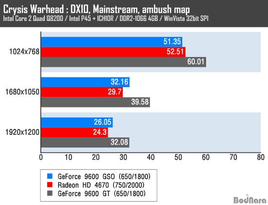 DirectX 10À» Áö¿øÇÏ´Â °ÔÀÓÀÎ Å©¶óÀ̽ýº ¿öÇìµåÀÇ º¥Ä¡¸¶Å© ÅøÀ» ÀÌ¿ëÇØ ambush ¸Ê¿¡¼ Æò±Õ ÇÁ·¹ÀÓÀ» ÃøÁ¤ÇÑ °á°ú 1024x768 ÇØ»óµµ¿¡¼´Â ¶óµ¥¿Â HD 4670 ¼º´ÉÀÌ ³ô°Ô ³ª¿ÔÁö¸¸ °íÇØ»óµµ·Î ¿Ã¶ó°¡¸é¼ ´Ù½Ã ÁöÆ÷½º 9600 GSO 512°¡ ¼ÒÆø ¿ìÀ§¸¦ º¸¿´´Ù. ÁöÆ÷½º 9600 GT´Â µÎ Á¦Ç°°ú È®½ÇÈ÷ Â÷À̰¡ ³ª´Â ¼º´ÉÀ» º¸¿© ȯÀ² »ó½ÂÀÌ ¾ø¾ú´Ù¸é ¸ÞÀνºÆ®¸²±Þ Á¦Ç°À¸·Î »ç¶û¹Þ¾ÒÀ» °Å¶ó´Â ¾Æ½¬¿òÀ» ÁØ´Ù.
