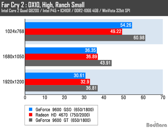 ¿ª½Ã DX10À» Áö¿øÇÏ´Â Far Cry 2 °ÔÀÓÀ» ÀÚü º¥Ä¡¸¶Å© ÅøÀ» ÀÌ¿ëÇØ Æò±Õ ÇÁ·¹ÀÓÀ» ÃøÁ¤ÇÑ °á°ú Å©¶óÀ̽ýº ¿öÇìµå¿Í´Â ¹Ý´ë·Î 1024x768 ÇØ»óµµ¿¡¼ ÁöÆ÷½º 9600 GSO 512ÀÇ Æò±Õ ÇÁ·¹ÀÓÀÌ ³ô¾ÒÁö¸¸, °íÇØ»óµµ·Î °¡¸é¼ ¶óµ¥¿Â HD 4670ÀÌ ´õ ÁÁÀº °á°ú¸¦ º¸¿©ÁÖ¾ú´Ù.