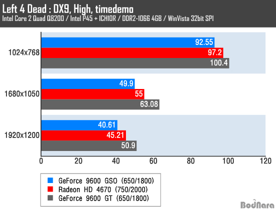 DX9À¸·Î µ¹¾Æ°¡´Â Left 4 Dead °ÔÀÓµµ ¸¶Âù°¡Áö·Î AA/AF¸¦ ¼³Á¤ÇÏÁö ¾ÊÀº »óÅ¿¡¼´Â ¸ðµç ÇØ»óµµ¿¡¼ ½ºÆ®¸² ÇÁ·Î¼¼¼ ¼ýÀÚ°¡ ÁÙ¾îµç ÁöÆ÷½º 9600 GSO 512°¡ ¶óµ¥¿Â HD 4670º¸´Ù ³·Àº Æò±Õ ÇÁ·¹ÀÓÀ» ±â·ÏÇß´Ù. ½ºÆ®¸² ÇÁ·Î¼¼¼ °¹¼ö°¡ ¸¹Àº ÁöÆ÷½º 9600 GT´Â 9600 GSO 512¿Í ´Þ¸® ¶óµ¥¿Â HD 4670º¸´Ù ³ôÀº ¼º´ÉÀ» º¸¿´´Ù.