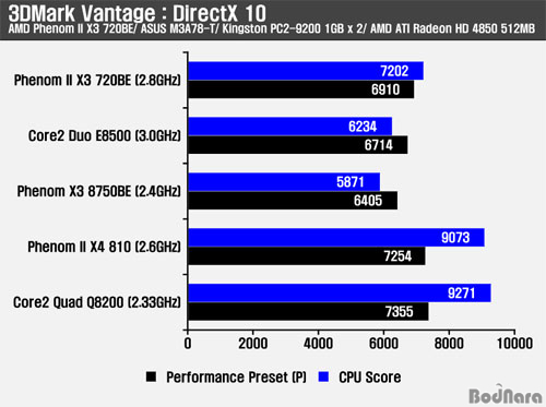 3DMark Vantage´Â ¸ÖƼÄÚ¾î CPU¸¦ Áö¿øÇÏ´Â º¥Ä¡¸¶Å© ÇÁ·Î±×·¥À¸·Î µà¾óÄھ´Ù´Â Æ®¸®ÇÃ, ÄõµåÄÚ¾î CPUµé¿¡¼ ´õ ³ôÀº ¼º´ÉÀ» Á¦°øÇÑ´Ù. °íŬ·°ÀÇ µà¾óÄÚ¾îÀÎ ÄÚ¾î2 µà¿À E8400 (3.0GHz)ÀÇ ¼º´ÉÀÌ ÄõµåÄھ Æä³Ñ2 X3 720BE (2.8GHz) Æ®¸®ÇÃÄھ´Ù ³·Àº ¼º´ÉÀ» º¸À̰í ÀÖ´Ù. À̸¦ ¹ÙÅÁÀ¸·Î 3DMark Vantageó·³ Æ®¸®ÇÃ/ ÄõµåÄÚ¾î CPU ÀÌ»óÀ» »ç¿ëÇÏ´Â ÇÒ °æ¿ì ³ôÀº ¼º´ÉÀ» ³»ÁÖ´Â °ÔÀӵ鿡¼´Â °íŬ·°ÀÇ µà¾óÄھ´Ù Æ®¸®ÇÃÀ̳ª ÄõµåÄÚ¾î CPU°¡ À¯¸®ÇÏ´Ù´Â °ÍÀ» È®ÀÎÇÒ ¼ö ÀÖ´Ù.