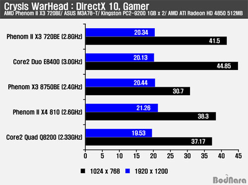 Crysis WarHead¿Í FarCry2´Â °íŬ·°ÀÇ CPUµéÀÌ À¯¸®ÇÑ °ÔÀÓÀÌ´Ù. °á°ú¿¡¼µµ ³ªÅ¸³µµíÀÌ °íŬ·° µà¾óÄÚ¾î CPUÀÎ ÀÎÅÚ E8400ÀÌ Æ®¸®ÇÃ/ ÄõµåÄÚ¾î CPUµéº¸´Ù ³ôÀº Ŭ·°À¸·Î °¡Àå ³ôÀº ÇÁ·¹ÀÓÀ» Á¦°øÇß´Ù.