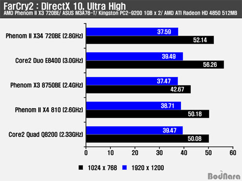 Æä³Ñ2 X3 720BE Æ®¸®ÇÃÄÚ¾î CPU ¿ª½Ã °°Àº 45nm °øÁ¤ÀÌ Àû¿ëµÈ ÄõµåÄÚ¾î Æä³Ñ2 X4 810º¸´Ù 200MHz°¡ ³ô¾Æ ÇÁ·¹ÀÓÀÌ ´õ ³ô¾ÒÀ¸¸ç, °æÀï CPUÀÎ E8400°ú´Â ÇÁ·¹ÀÓ Â÷À̵µ ¾à 5fps Á¤µµÀÇ Â÷À̸¦ º¸¿´´Ù. ÇÏÁö¸¸, ÇöÀç Çü¼ºµÈ °¡°Ý (Æä³Ñ2 X3 720BE : 206,000¿ø, E8400 : 222,000¿ø)À¸·Î º¸¸é, ÇÁ·¹ÀÓ Â÷ÀÌ´Â °¨¼öÇÒ ¸¸ÅÀÇ Â÷À̸¦ º¸¿©ÁØ´Ù.