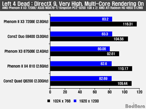 Left 4 Dead´Â 3DMark Vantage¿Í ¸¶Âù°¡Áö·Î Æ®¸®ÇÃ/ ÄõµåÄÚ¾î CPUµé¿¡¼ À¯¸®ÇÏ´Ù. °íŬ·° µà¾óÄÚ¾îÀÎ E8400°ú ºñ±³ÇÏ¿© ÄõµåÄÚ¾î CPUµéÀº CPUÀÇ Ã³¸® ¼º´É¿¡ ¿µÇâÀ» ¹Þ´Â ÀúÇØ»óµµ¿¡¼ ´õ ³ôÀº ÇÁ·¹ÀÓÀ» ¾ò¾úÀ¸¸ç, °íŬ·° Æ®¸®ÇÃÄÚ¾î Æä³Ñ2 X3 720BE CPU´Â ´Ù¸¥ µÎ ÄõµåÄÚ¾î¿Í µà¾óÄھ´Ù ³ôÀº ÇÁ·¹ÀÓÀ» Á¦°øÇÑ´Ù.