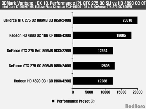 3DMark Vantage´Â ±×·¡ÇÈ Ä«µåÀÇ ±âº» ¼º´ÉÀ» ÃøÁ¤ÇÒ ¼ö Àִµ¥ ½Ì±Û ±¸¼º¿¡¼ GeForce GTX 275 OC´Â °°Àº ¿À¹öŬ·° ¹öÀüÀÎ HD 4890 OC¸¦ ¾Õ¼¹À¸¸ç, GTX 275 ·¹ÆÛ·±½ºµµ ¾à°£ÀÇ Â÷ÀÌ·Î HD 4890 OCÀÇ ¼º´ÉÀ» ¾Õ¼¹´Ù. SLI¿Í CF ±¸¼º¿¡¼ ¿ª½Ã GTX 275 OC ¹öÀüÀÌ °¡Àå ³ôÀº ¼º´ÉÀ» º¸¿©ÁÖ°í ÀÖ´Ù. ¼º´É Çâ»ó ºñÀ²À» »ìÆìº¸¸é, GTX 275 OC ½Ì±Û°ú ºñ±³ÇÏ¿© GTX 275 SLI´Â 61.44% Çâ»ó, HD 4890 OC ½Ì±ÛÀº HD 4890 OC CF¿Í ºñ±³ÇÏ¿© 47.01% Çâ»óµÈ ¼º´ÉÀ» Á¦°øÇÑ´Ù.