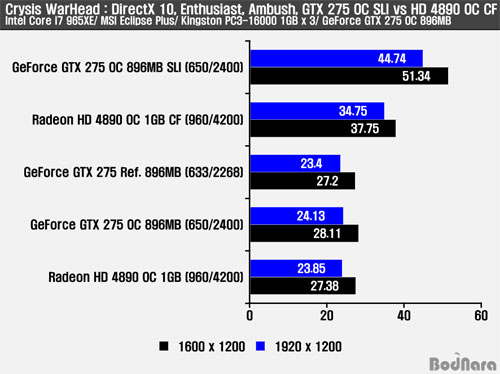 Crysis WarHead´Â DirectX 10 ȯ°æ°ú Ambush ±âº» µ¥¸ð¸¦ ÀÌ¿ëÇÏ¿© Å×½ºÆ®¸¦ ÁøÇàÇÏ¿´À¸¸ç, NVIDIA ÃÖÀûÈ °ÔÀÓ ´ä°Ô ½Ì±Û ±¸¼º°ú ¸ÖƼ GPU ±¸¼º ¸ðµÎ¿¡¼ NVIDIA ±×·¡ÇÈ Ä«µåµéÀÇ ¼º´ÉÀÌ ¿ì¼öÇß´Ù. ½Ì±Û ±¸¼ºº¸´Ù ¸ÖƼ GPU ±¸¼º¿¡¼ GTX 275ÀÇ SLI ¼º´ÉÀº Å« Çâ»óÀ» º¸ÀδÙ.