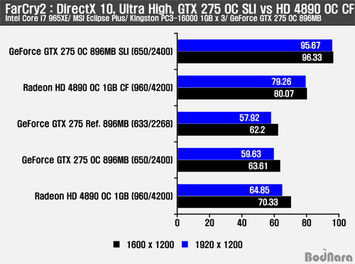 FarCry2´Â DirectX 10 ȯ°æ°ú Small Ranch ±âº» µ¥¸ð¸¦ ÀÌ¿ëÇÏ¿© Å×½ºÆ®¸¦ ÁøÇàÇÏ¿´À¸¸ç, Å×½ºÆ® °á°ú ½Ì±Û ±¸¼º¿¡¼´Â HD 4890 OC°¡ ÇØ»óµµ¿¡ µû¶ó ÃÖ´ë 7 ÇÁ·¹ÀÓ °¡±îÀÌ ´õ ³ôÀº ÇÁ·¹ÀÓÀ» Á¦°øÇÏ¿© °æÀï Á¦Ç°À» ¾Õ¼´Â ¼º´ÉÀ» º¸¿©ÁÖ¾ú´Ù. ±×·¯³ª, ¸ÖƼ GPU ±¸¼º¿¡¼ HD 4890 OC CrossFire ±¸¼ºÀº ¾Õ¼ÀÇ 3DMark Vatage, Crysis WarHead °ÔÀÓó·³ GTX 275 OC SLI ±¸¼º¿¡¼ °¡Àå ³ôÀº ¼º´ÉÀ» Á¦°øÇß´Ù.