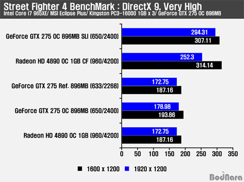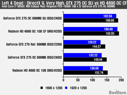 GTX 275 OC ½Ì±ÛÀº GTX 275 SLI¿Í ºñ±³ÇÏ¿© 1600/ 1920 ÇØ»óµµ¿¡¼´Â °¢°¢ 51.44/ 60.44% Çâ»ó, HD 4890 OC ½Ì±ÛÀº HD 4890 OC CF¿Í ºñ±³ÇÏ¿© 1600/ 1920 ÇØ»óµµ¿¡¼ °¢°¢ 13.85/ 22.22%ÀÇ ¼º´É Çâ»óÀ» º¸¿©ÁØ´Ù.