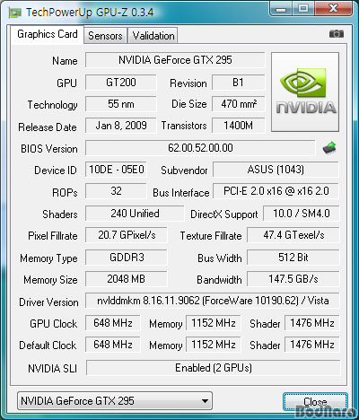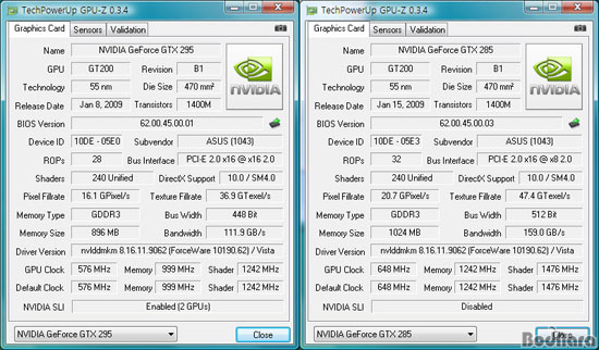 ¸ÕÀú ¿£ºñµð¾Æ µà¾ó GPU Ç÷¡±×½Ê ¸ðµ¨ÀÎ ÁöÆ÷½º GTX 295(ÁÂ)¿Í ½Ì±Û GPU Ç÷¡±×½Ê ¸ðµ¨ GTX 285(¿ì)¸¦ GPU-Z¸¦ ÅëÇØ »ìÆìº¸¸é µÑ ´Ù 55nm °øÁ¤ÀÇ GT200 Äھ »ç¿ëÇϰí ÀÖÁö¸¸, µà¾ó GPU Á¦Ç°ÀÎ GTX 295°¡ µ¿ÀÛ Å¬·°À» ºñ·ÔÇØ ROPs, ¸Þ¸ð¸® ÀÎÅÍÆäÀ̽º, ¸Þ¸ð¸® ¿ë·® µî¿¡¼ GTX 285º¸´Ù ¶³¾îÁö´Â °ÍÀ» È®ÀÎÇÒ ¼ö ÀÖ´Ù.