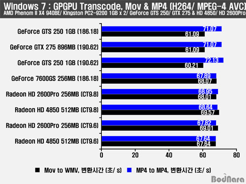 À©µµ¿ì 7 RTM µå·¡±× ¾Ø µå·Ó Æ®·£½ºÄÚµù °á°ú GeForce ½Ã¸®ÁîµéÀº MP4 ¿µ»ó º¯È¯°ú ÀúÀå ½Ã°£ÀÌ À©µµ¿ì 7 RC¿¡ »ç¿ëµÈ °°Àº Ä«µå¿¡¼ ¾à°£ ½Ã°£ÀÌ ´Ã¾úÀ¸¸ç, Àüü ó½Ã ½Ã°£ÀÌ ´Ã¾î³ °á°ú´Â À¯ÁöµÇ°í ÀÖ´Ù. ÀÌ´Â ÃÖÁ¾ °á°ú¹° ¿ë·® ¾ÐÂø ¹× fps º¯È¿¡ µû¸¥ ºÎºÐÀ¸·Î º¼ ¼ö ÀÖ´Ù. Mov ¿µ»óÀº Radeon HD 4850¿¡¼´Â À©µµ¿ì 7 RC¿Í º¯È°¡ ¾ø°í GeForce ½Ã¸®ÁîµéÀº ÇØ»óµµ, fps, ºñÆ®·¹ÀÌÆ®¿¡ º¯È°¡ ÀÌ·ç¾îÁ³°í °á°ú¹° ¿ë·®µµ 22.9MB·Î ÁÙ¾ú´Ù. Å×½ºÆ® °á°ú´Â °°Àº Ä«µå¿¡¼ À©µµ¿ì 7 RTMÀÌ Á¶±Ý ´õ »¡¶ú´Ù. HD 4850°ú HD 2600Pro´Â Å« º¯È°¡ ¾ø´Ù.