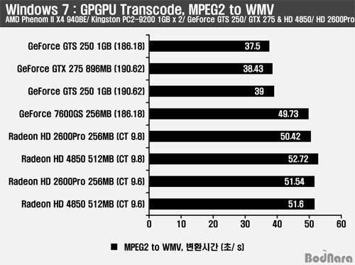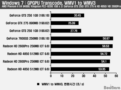 µå·¡±× ¾Ø µå·Ó Æ®·£½ºÄÚµù½Ã À©µµ¿ì 7 RTM°ú À©µµ¿ì 7 RC´Â °øÅëÀûÀ¸·Î CUDA Áö¿ø GeForce GTS 250, GTX 275 Á¦Ç°Àº CUDA °¡¼ÓÀ» ÅëÇØ Æ®·£½ºÄÚµù ¹× ÀúÀåµÇ´Â ½Ã°£ÀÌ Àý¹Ý¿¡ °¡±õ°Ô ÁÙ¾îµé°í ÀÖ´Ù. ¶Ç, °°Àº Á¦Ç°¿¡¼ÀÇ Æ®·£½ºÄÚµù ½Ã°£Àº À©µµ¿ì 7 RTMÀÌ ¾à°£ ´õ ³ªÀº ¸ð½ÀÀ» º¸¿©ÁÖ°í ÀÖÀ¸¸ç, HD 4850Àº ¾Õ¼ ¾ð±ÞÇßµíÀÌ ÇöÀç ATI StreamÀ¸·Î °¡¼ÓÇÏÁö ¸øÇϹǷΠÀ©µµ¿ì 7 RCº¸´Ù ¾à°£ ´À·ÁÁø ó¸® ½Ã°£À» Á¦¿ÜÇϸé CUDA Áö¿ø GeForce ½Ã¸®Áîµéº¸´Ù ó¸® ½Ã°£ÀÌ ¿©ÀüÈ÷ ´À¸®´Ù.