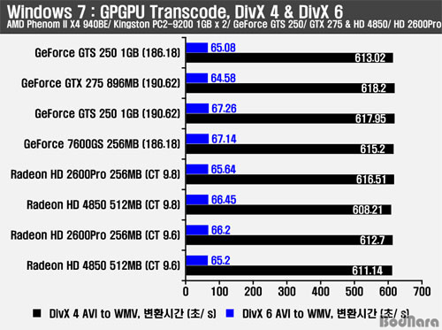 µå·¡±× ¾Ø µå·Ó Æ®·£½ºÄÚµù Å×½ºÆ® °á°ú´Â CUDA Áö¿ø GeForce ½Ã¸®ÁîµéÀº DivX4/ 6 ÄÚµ¦ÀÌ Àû¿ëµÈ ¿µ»óÀ» Á¦¿ÜÇϰí WMV, MPEG2, H264 ÄÚµ¦ Àû¿ë ¿µ»ó¿¡¼´Â CUDA °¡¼ÓÀ» ÅëÇØ Æ®·£½ºÄÚµù ÈÄ Ã³¸® ½Ã°£ÀÌ ´ëºÎºÐ ´ÜÃàµÇ´Â °á°ú¸¦ ³ªÅ¸³Â°í ATI Stream Áö¿ø HD 4850Àº īŻ¸®½ºÆ® 9.8¿¡¼ µå·¡±× ¾Ø µå·Ó Æ®·£½ºÄÚµù °¡¼ÓÀ» Áö¿øÇÏÁö ¸øÇϰí ÀÖ´Ù. À©µµ¿ì 7 RC¿Í RTM °£ÀÇ º¯È¯ ÈÄÀÇ °á°ú¹° Â÷ÀÌ´Â ¿ë·®ÀÌ Áٰųª À¯Áö, fps³ª ºñÆ®·¹ÀÌÆ®°¡ ¾à°£Àº º¯°æµÇ¾úÁö¸¸, GPU °¡¼Ó ºÎºÐÀº °ÅÀÇ Â÷À̰¡ ¾ø´Ù. Âü°í·Î ATI Stream Áö¿ø HD 4800 ½Ã¸®ÁîÀÇ °æ¿ì īŻ¸®½ºÆ® 9.10¿¡¼ À©µµ¿ì 7 µå·¡±× ¾Ø µå·Ó Æ®·£½ºÄÚµù½Ã GPU °¡¼ÓÀ» Áö¿øÇÒ °ÍÀ¸·Î ¾Ë·ÁÁö°í ÀÖ¾î ¿©ÀüÈ÷ CUDA Áö¿ø GPUµéÀ» »ç¿ëÇÏ´Â °ÍÀÌ ´õ À¯¸®ÇÏ´Ù.