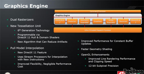 ¶Ç, DirectX 11¿¡ ¸Â´Â Å×¼¿·¹ÀÌ¼Ç À¯´Ö (Å×¼¿·¹ÀÌÅÍ)¸¦ ³»ÀåÇß´Ù. AMD ATI¿¡¼´Â À̸¦ 6¼¼´ë ±â¼ú·Î º¸°í ÀÖÀ¸¸ç, ÇÁ·Î±×·¡¸Óºí °¡´ÉÇÑ DirectX 11 Hull°ú Domain ½¦ÀÌ´õµµ ÇÔ²² Æ÷ÇԵȴÙ. ¶Ç, Á¤Á¡ »ý¼º½Ã ¸¸µé¾îÁö´Â ºÒÇÊ¿äÇÑ ÀÎÀ§ÀûÀÎ ±¸Á¶¹° (Á¤Á¡ »ý¼º½Ã ºÎÇϸ¦ ³ôÀÌ´Â µîÀÇ ºÒÇÊ¿äÇÑ °Íµé)À» ÁÙÀÌ´Â »õ·Î¿î ¾Ë°í¸®ÁòÀ» µµÀÔÇß´Ù.