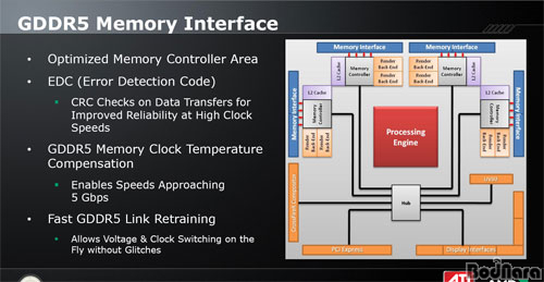 HD 5800 ½Ã¸®Áî¿¡´Â °íŬ·°À» À§ÇØ GDDR5 ¸Þ¸ð¸®¸¦ HD 4800 ½Ã¸®Áî¿Í °°ÀÌ µµÀÔÇßÀ¸¸ç, Hub ¹æ½ÄÀÇ ¸Þ¸ð¸® ÄÁÆ®·Ñ·¯ ±¸¼ºÀ» ÇÑ´Ù. HD 5800 ½Ã¸®ÁîÀÇ ¸Þ¸ð¸® ÀÎÅÍÆäÀ̽º´Â HD 4800 ½Ã¸®Áî¿Í °°Àº 256bit·Î ±¸¼ºµÈ´Ù. HD 5870Àº 5Gbps (5000MHz)¸¦ Áö¿øÇÏ´Â ³ôÀº Ŭ·°À» Áö¿øÇÏ´Â GDDR5 ¸Þ¸ð¸®°¡ »ç¿ëµÈ´Ù. ¶ÇÇÑ, ±âÁ¸ HD 4800º¸´Ù ÃÖÀûÈµÈ ¸Þ¸ð¸® ÄÁÆ®·Ñ·¯ ¿µ¿ª, ¿¡·¯°¨Áö Äڵ带 ÅëÇØ °íŬ·°ÀÇ µ¥ÀÌÅÍ Àü¼Û¿¡¼µµ ½Å·Úµµ¸¦ ³ô¿©ÁÖ°í ÀÖ´Ù.