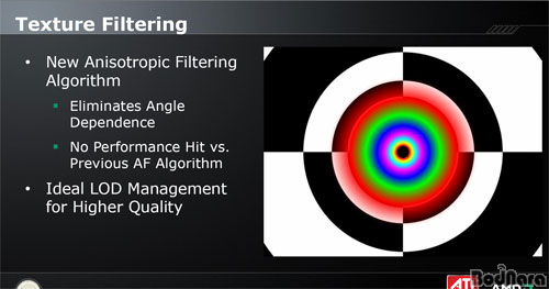 HD 5800 ½Ã¸®Áî´Â AF (Anisotropic Filtering, ºñµî¹æ¼ºÇÊÅ͸µ (AMD ATI) ¶Ç´Â À̹漺ÇÊÅ͸µ (NVIDIA)·Î Ç¥±â)ÀÇ »õ·Î¿î ¾Ë°í¸®Áò µµÀÔÀ» ÅëÇØ AF È¿À²°ú ¼º´ÉÀ» °³¼±Çß´Ù. »õ·Î¿î AF ¾Ë°í¸®ÁòÀº ÀÌÀü AF ¾Ë°í¸®Áò°ú ºñ±³ÇÏ¿© ¸ð¼¸® ÀÇÁ¸ °¨¼Ò ¹× ¼º´É»óÀÇ ¹®Á¦¸¦ °³¼±ÇßÀ¸¸ç, °íǰÁúÀ» À§ÇØ LOD ó¸® (Level Of Detail, ·»´õ¸µ ¼Óµµ¿Í ǰÁú »çÀÌÀÇ ¸ðµ¨¸µ µ¥ÀÌÅÍÀÇ Á¤¹Ðµµ ´Ü°è¸¦ ÁöÁ¤ÇÏ´Â ±â¼úÀÌ´Ù. °¡±î¿î °ÍÀº ÀÚ¼¼È÷ ¸Õ °ÍÀº È帮°Ô, ½ÇÁ¦·Î´Â ¸Õ °Íµµ 100% 󸮵Ǹç, ¸Ö¸®ÀÖ´Â ¹°Ã¼´Â ´ëÃæ Ç¥ÇöÇØµµ µÇ´Â Á¡À» ÀÌ¿ëÇÑ ±â¼úÀÌ´Ù.)µµ º¸´Ù È¿À²ÀûÀ¸·Î °³¼±µÇ¾ú´Ù.