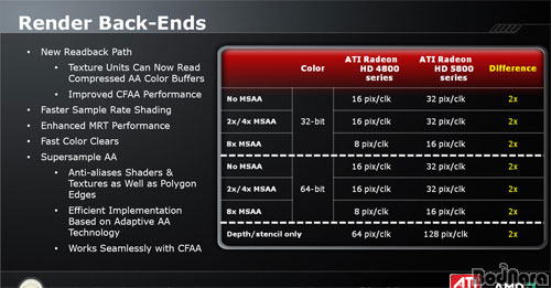 ¶Ç, °íÇØ»óµµ¿Í ¾ÈƼ¾Ù¸®¾î½ÌÀÇ ¼º´É ÀúÇϸ¦ °³¼±Çϱâ À§ÇØ 2¹è·Î Áõ°¡µÈ Render back-ends (ROP), ÃÖ´ë 6°³ÀÇ ¸ð´ÏÅ͸¦ Áö¿øÇÒ ¼ö ÀÖµµ·Ï °³¼±µÈ µð½ºÇ÷¹ÀÌ ÄÁÆ®·Ñ·¯ (ATI Eyefinity ±â¼ú)µµ Ãß°¡µÇ¾ú´Ù.
