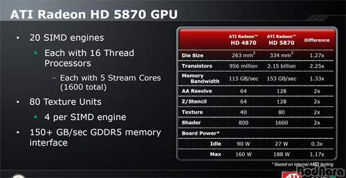 - DirectX 11¿¡ ÃÖÀûÈµÈ ¾ÆÅ°ÅØÃ³ - Å×¼¿·¹ÀÌÅÍ Ãß°¡, GPGPU ¹× ¸ÖƼ½º·¹µù °È - ½ºÆ®¸² ÇÁ·Î¼¼¼ 2¹è Áõ°¡ (800 - > 1600/ 1440) - 2¹ø ° 40nm °øÁ¤ (HD 4770¿¡ ÀÌÀº 40nm °øÁ¤) - °íŬ·° GDDR5 ¸Þ¸ð¸® »ç¿ë ¹× ¿¡·¯Á¤Á¤ ±â´É Æ÷ÇÔ - ÅØ½ºÃ³ ó¸® À¯´Ö 20°³·Î ´Ã¾î³ª ÅØ½ºÃ³ ó¸®Çâ»ó (40 -> 80) - Z/Stencil 64¿¡¼ 128·Î 󸮼º´É 2¹è Çâ»ó - ÅØ½ºÃ³ ÇÊÅ͸µ ¾Ë°í¸®Áò °³¼±À¸·Î È¿À²ÀûÀΠó¸® ¹× ¼º´É Çâ»ó - Render Back-Ends (ROP) À¯´Ö 2¹è Áõ°¡ (16 -> 32) - Çâ»óµÈ Àü·Â°ü¸® (ATI PowerPlay °³¼±, GDDR5 Ŭ·° ¹× Àü¾Ð °¨¼Ò)