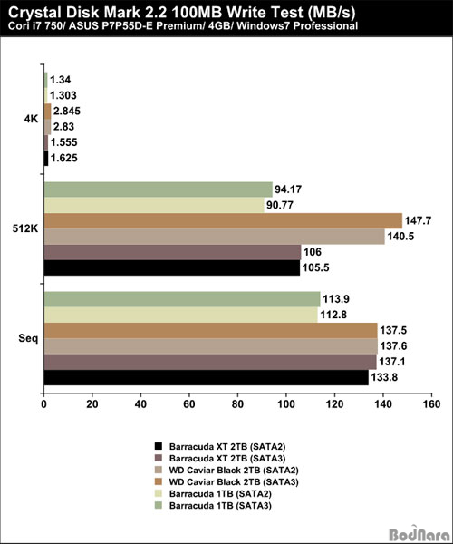 Crystal Disk Mark 2.2ÀÇ °á°ú ¿ª½Ã ¾Õ¼± µÎ ÇÁ·Î±×·¥¿¡ ÀÇÇÑ Å×½ºÆ®¿Í ´Þ¸® °¢ Çϵåµð½ºÅ©ÀÇ ¿¬°á ÀÎÅÍÆäÀ̽º¸¦ SATA2¿¡¼ SATA3·Î ¹Ù²Ü °æ¿ì »ó´ëÀûÀ¸·Î ³ôÀº ¼º´É Çâ»ó ÆøÀ» º¸¿©ÁÖ¾ú´Ù. ±×·¯³ª SATA3 ÀÎÅÍÆäÀ̽ºÀÇ Barracuda XT 2TB¸¦ SATA3 ÀÎÅÍÆäÀ̽º·Î ¸ÞÀκ¸µå¿Í ¿¬°áÇÏ´Â °æ¿ì¿¡µµ SATA2¿¡¼ SATA3·ÎÀÇ ÀÎÅÍÆäÀ̽º º¯È¸¸ÅÀÇ ¼º´É Â÷ÀÌ´Â ³ªÁö ¾Ê´Â´Ù. |  |