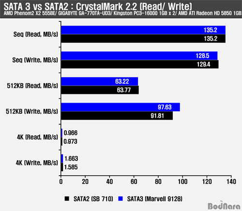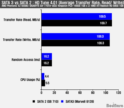 AMD 770 + SB710 Á¶ÇÕÀº ¾Õ¼ ¾ð±ÞÇß´ø °Íó·³ Ĩ¼Â ÀÚü¿¡¼ ´ë¿ªÆøÀ» È®º¸ (PCIe 2.0 1·¹ÀÎ, 500MB/s)ÇÒ ¼ö ÀÖ°Ô ·¹ÀÎÀ» ÇÒ´çÇÒ ¼ö ÀÖÀ¸¹Ç·Î USB 3.0¿¡¼´Â USB 2.0º¸´Ù ÃæºÐÇÑ ´ë¿ªÆø È®º¸¸¦ ÅëÇØ SATA2/ 3 ÀÎÅÍÆäÀ̽º¸¦ »ç¿ëÇÏ´Â °Í°ú Å« Â÷À̾ø´Â ¼º´ÉÀ» ¾òÀ» ¼ö ÀÖ°Ô µÈ´Ù. SATA2¿Í SATA3 ÀÎÅÍÆäÀ̽º´Â Àü¼Û¼Óµµ°¡ 2¹è·Î Áõ°¡µÇÁö¸¸, ÇöÀçÀÇ HDD´Â SATA2 (3Gbps)¸é ÃæºÐÇÑ ´ë¿ªÆø È®º¸°¡ °¡´ÉÇÏ¿© Àü¼Û¼Óµµ°¡ 6Gbps (SATA3)À¸·Î ´Ã¾î³ªµµ ¼º´É¿¡ Å« ¿µÇâÀ» ÁÖÁö ¸øÇÑ´Ù. ´Ù¸¸, SSDó·³ °í¼ÓÀ¸·Î µ¿ÀÛÇÏ°í ´ë¿ªÆøÀ» HDDº¸´Ù ´õ ÇÊ¿ä·Î ÇÏ´Â °æ¿ì SATA3 ÀÎÅÍÆäÀ̽º´Â ÀåÁ¡À¸·Î ÀÛ¿ëµÈ´Ù. SATA2/ 3ÀÇ º¯È ºÎºÐ°ú ¼º´É¿¡ ´ëÇÑ ³»¿ëÀº ´ë¿ªÆø 600MB/s, SATA3ÀÇ ÇöÀç¿Í Àü¸ÁÀº? ±â»ç¸¦ ÂüÁ¶ÇÏÀÚ.