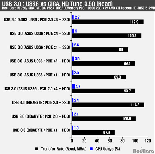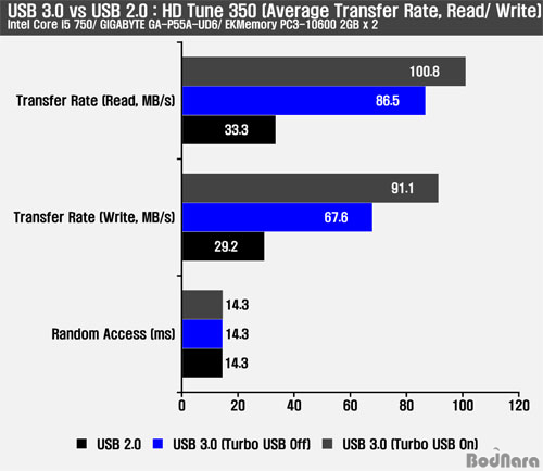 ¸°Çʵå + P55 Á¶ÇÕÀ» »ç¿ëÇÒ °æ¿ì ¸°ÇʵåÀÇ PCI-Express 8 ·¹ÀÎÀ» ±×·¡Çȿ뿡 ³ª¸ÓÁö 8 ·¹ÀÎÀ» SATA3³ª USB 3.0¿¡ ÇÒ´çÇÏ¿© ´ë¿ªÆøÀ» È®º¸ÇÑ´Ù. ±×·¡ÇÈ 8 ·¹ÀÎÀ» »ç¿ëÇÏÁö ¾ÊÀ» °æ¿ì (Turbo USB Off) PCIE 1.1 1·¹ÀÎ (250MB/s)ÀÇ ´ë¿ªÆø¸¸À» Ȱ¿ëÇϹǷΠ¼º´ÉÀÌ ¶³¾îÁö´Âµ¥ À̵µ USB 2.0º¸´Ù Å©°Ô Çâ»óµÈ ¼º´ÉÀ» Á¦°øÇØÁÖ¸ç, 8 ·¹ÀÎÀ» Ȱ¿ëÇÒ °æ¿ì (Turbo USB On)´Â USB 3.0ÀÇ ´ë¿ªÆøÀ» ´õ È®º¸ÇÏ¿© HDDÀÇ ¼º´ÉÀ» ´õ ²ø¾î³¾ ¼ö ÀÖ°Ô µÈ´Ù. Å×½ºÆ®´Â ¸°Çʵå ÄÚ¾î i5 750°ú Seagate Barracuda 7200.12 7200RPM 1TB HDD¸¦ ÀÌ¿ëÇß´Ù.